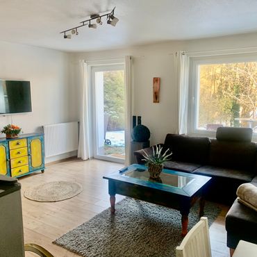 Sunny, beautifully furnished designer apartment for 1-3 years, fully equipped, 2.5-room ground floor apartment, fitted kitchen, garden.