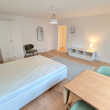 Fully equipped 1-room apartment including parking space, 5 minutes to Mercedes Benz, 15 minutes to the center
