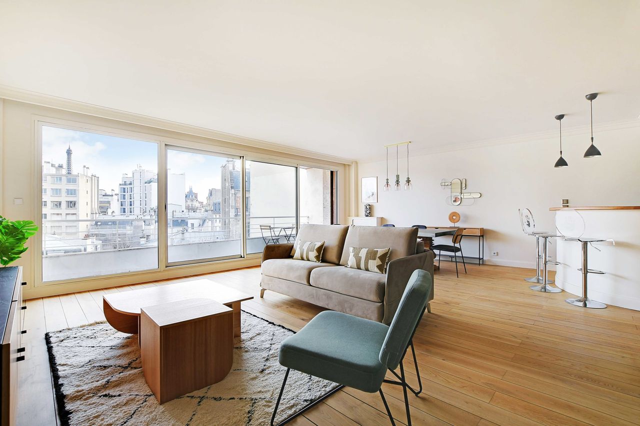 It is a 100m² flat located on the 5th floor with lift. It is composed of: - An open kitchen, equipped and functional: fridge, hob, coffee machine, toaster, kettle, microwave, oven, dishwasher, washing machine, tumble dryer... - A living room with a sofa, TV and balcony with a view of the Eiffel Tower - Two bedrooms with double bed and small balcony - A dressing room - A bathroom with bathtub - Separate toilet - Storage space - TV and broadband internet - Bed linen and towels provided The neighb...