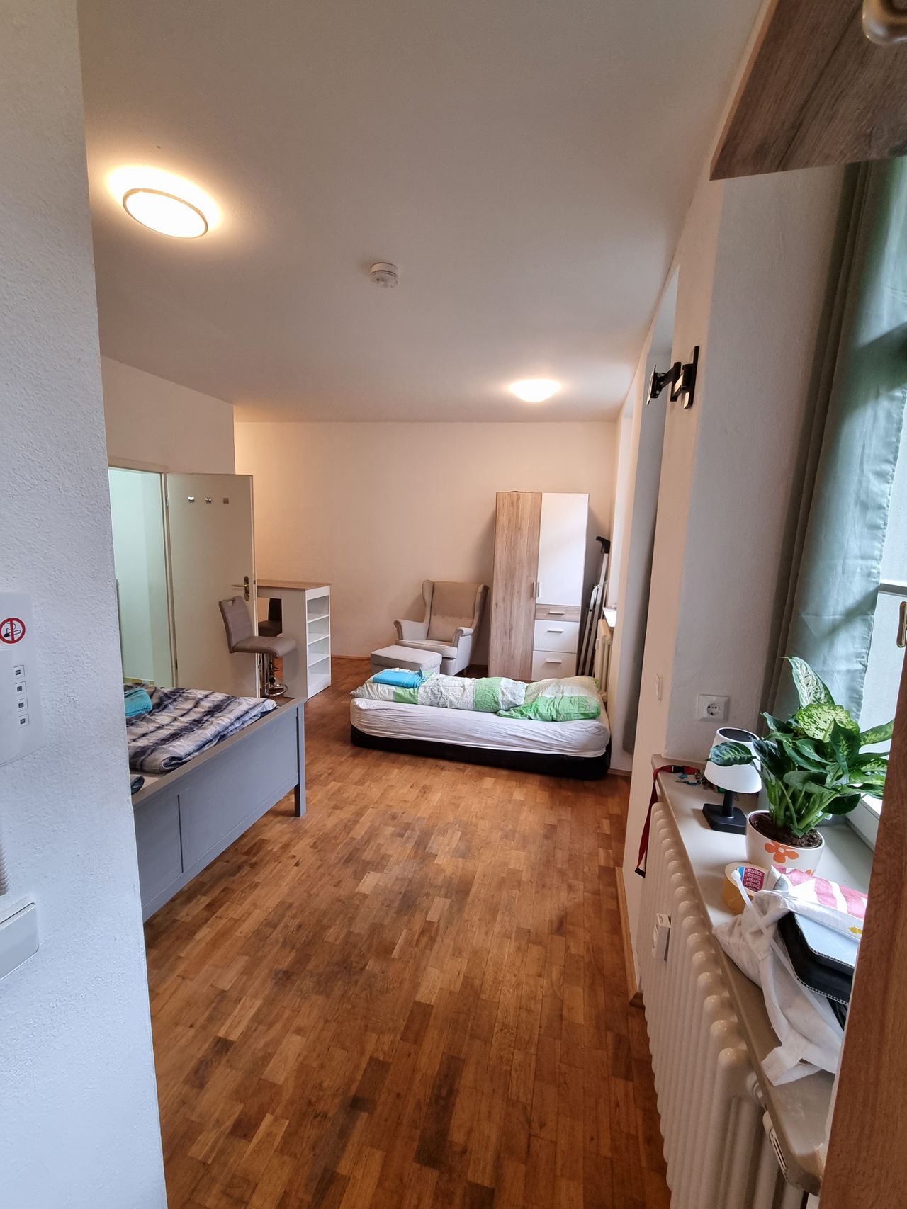 Lovingly furnished apartment in the heart of Dresden in a quiet neighborhood. A total of four windows create a bright, welcoming one-room apartment with a fitted kitchen on ground floor. The building is mostly occupied by young people, creating a relaxed atmosphere. The apartment is furnished and ready to move into. The bed (160 cm wide) is new and includes a great mattress. Everything you need (sights, supermarkets, parks) is within walking distance.
