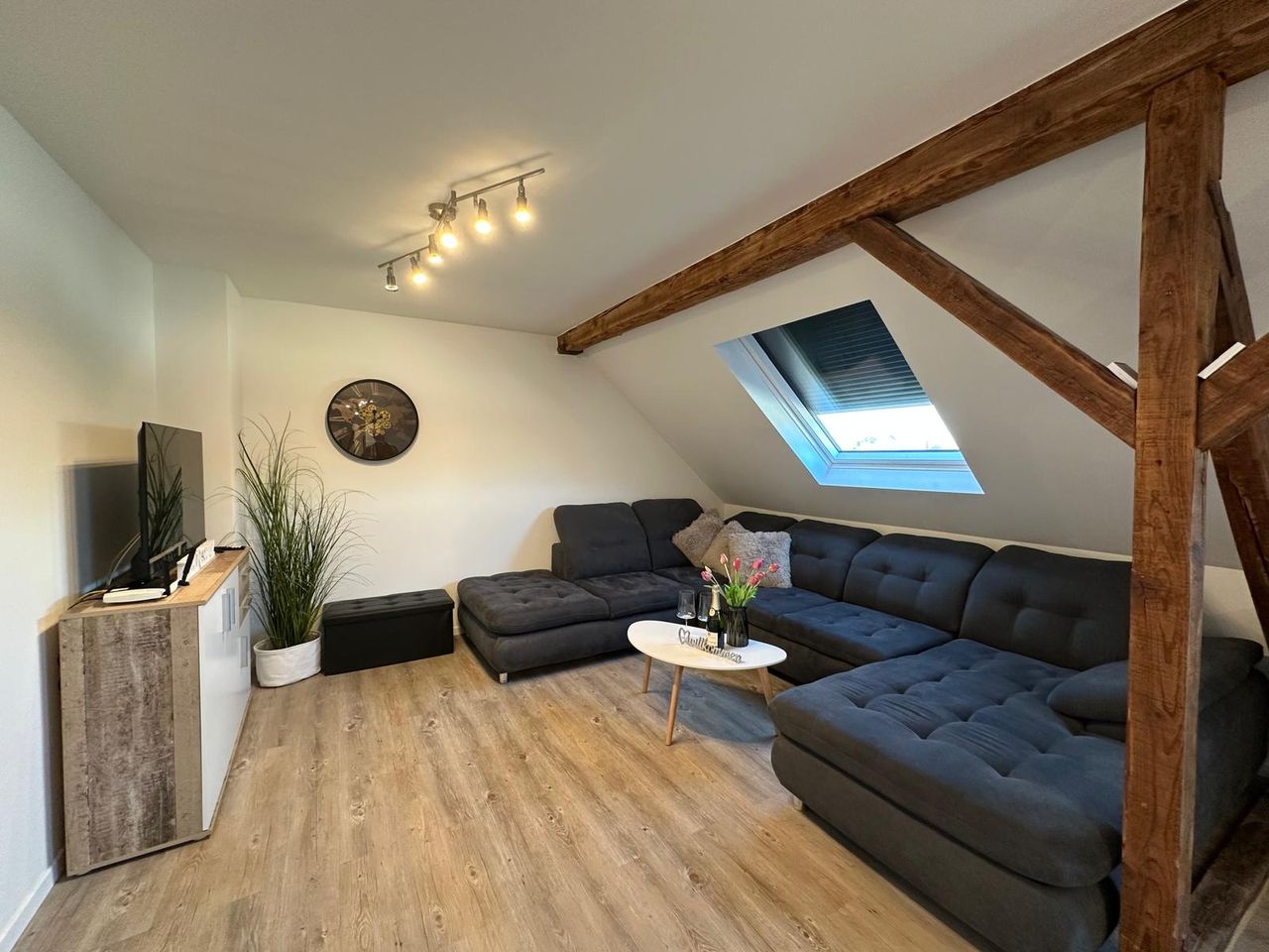Newly renovated and very tastefully furnished apartment on the top floor of an apartment building. The apartment is located on the 4th floor and is only accessible via the stairs. But the climb is worth it: once you reach the top, you'll find a quiet retreat with a feel-good atmosphere. The open-plan living/dining area is generously designed and the exposed timber framing creates an exceptional living experience. The high-quality fitted kitchen with granite countertops and a breakfast bar is ful...