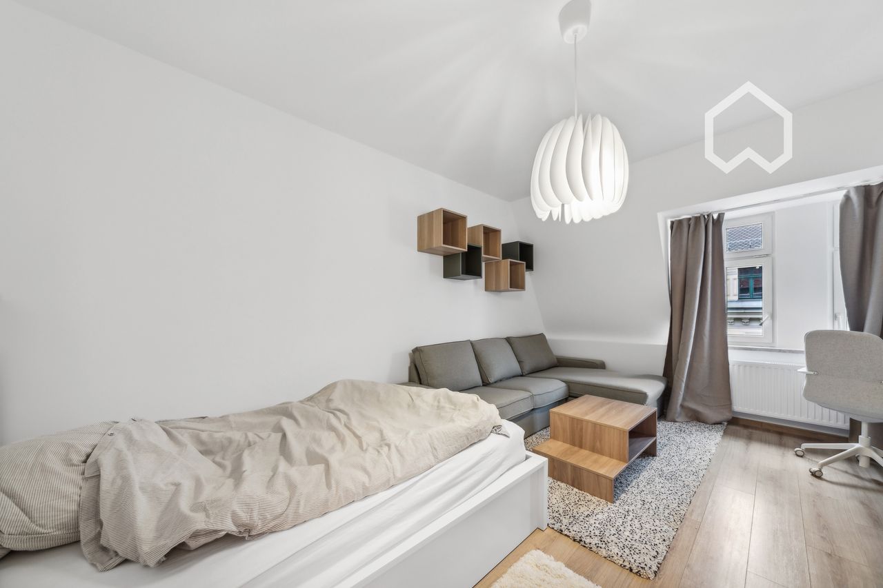 Welcome to this stylishly renovated 3-room flat share on the light-flooded and quiet top floor (4th floor of a charming and friendly house from the 19th century). The apartment is freshly furnished and offers students, interns, expats and business travellers with a longer rental period a cosy ambience with the possibility to individualize your own 4 walls a little bit to feel even more “at home”. Your room (nr 2 with 19m2) is fully furnished with a comfortable bed, closet, spacious desk, plenty...