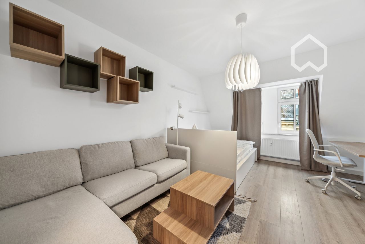 Welcome to this stylishly renovated 3-room flat share on the light-flooded and quiet top floor (4th floor of a charming and friendly house from the 19th century). The apartment is freshly furnished and offers students, interns, expats and business travellers with a longer rental period a cosy ambience with the possibility to individualize your own 4 walls a little bit to feel even more “at home”. Your room (bedroom number 1 with 19 m2) is furnished with a comfortable bed, closet, spacious desk,...