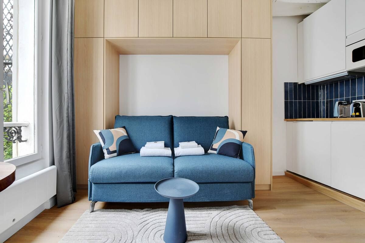 Located on the second floor of a typical Parisian building without an elevator, this apartment consists of: - A bright and welcoming living room with a sleeping area featuring a quality sofa bed, a side table, and a Smart TV for your relaxation. - A practical and fully equipped kitchen with a refrigerator, kettle, coffee machine, toaster, induction hob, and microwave. - A washing machine is also available for your convenience. - A modern bathroom with a spacious Italian shower, sink, and toilet...