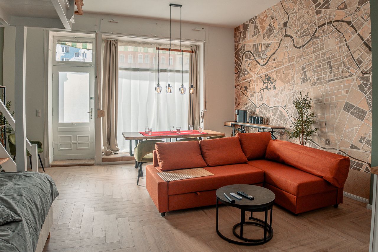 At a glance: ➜ Two luxurious box-spring beds (180x200 & 160x200) ➜ Mezzanine level & sofa bed ➜ Two large 65-inch 4K Smart TVs ➜ Game console ➜ Board games ➜ Fast Wi-Fi (100 Mbit) ➜ Fully equipped kitchen with dishwasher & washing machine ➜ Self check-in Design highlight: large wall map in the living room and a unique bicycle console table The bright main room is the heart of the apartment: A comfortable box-spring bed (160x200), a sofa bed, and a mezzanine level provide flexible sleeping arr...