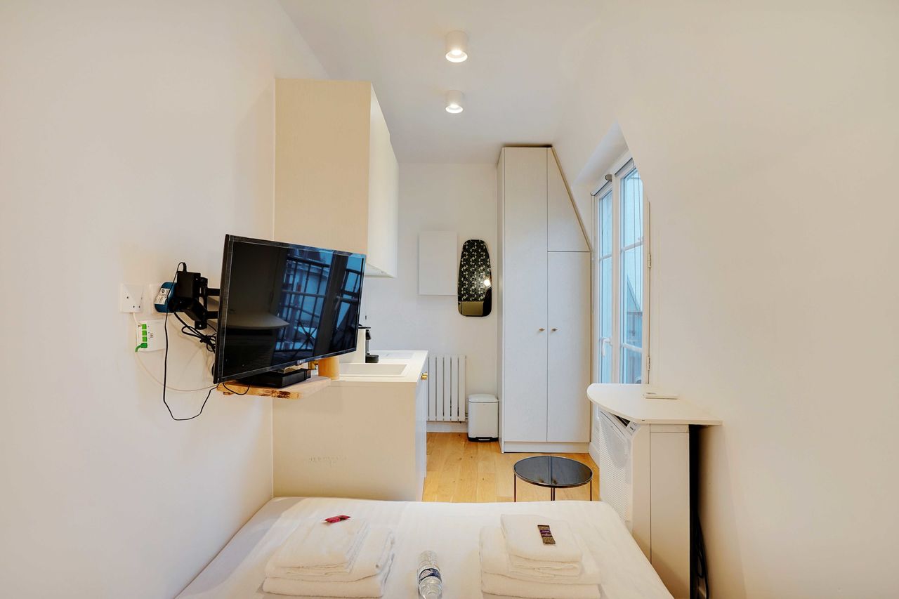 It is a studio of 11m ² located on the 6th floor (elevator to the 5th floor then stairs to the 6th floor). It is composed of: - An open kitchenette equipped and functional : fridge, cooking plates, coffee machine, toaster, kettle... - A living space with a sofa bed, a TV. - A private shower room with toilet located outside the apartment on the same floor. - Storage space - TV and high speed internet - Sheets and towels provided