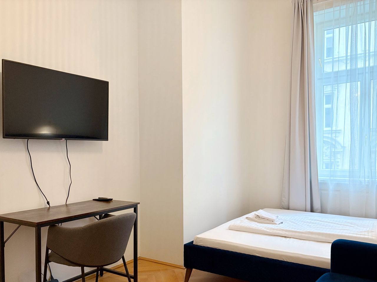 It’s a private room in the shared apartment located in building with an elevator. The room is for 1 guest, the apartment itself has a fully equipped kitchen, a bathroom and WC, a washer and free WiFi. There’s an underfloor heating system and central water supply in the building. For the summer season, guests are provided with a cooling fan.