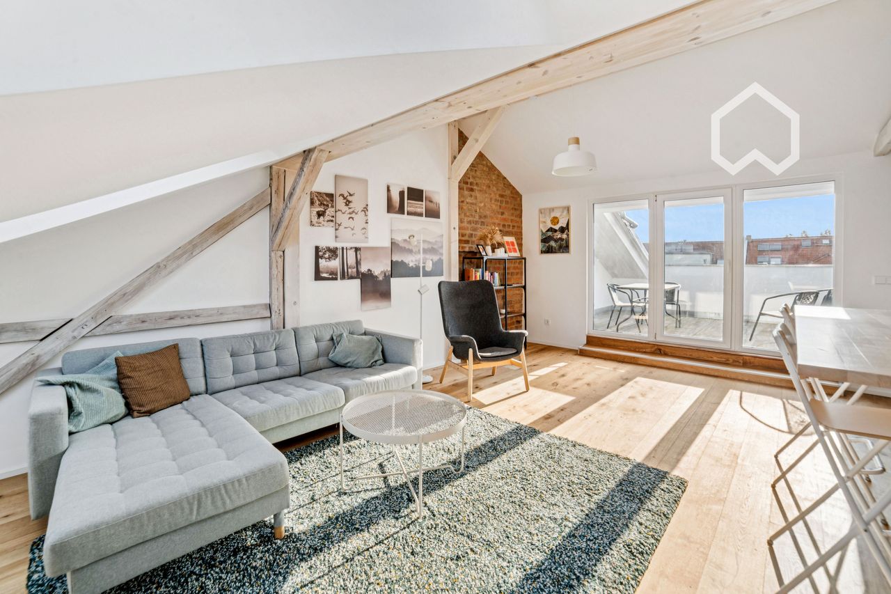 This cosy top-floor flat with 2 bedrooms, a kitchen, a living room, a bathroom, and a terrace is located in vibrant Leipzig. There are plenty of shops, bars, and restaurants in the immediate vicinity. You can easily reach the city centre by tram, which stops just a few minutes' walk away. The accommodation is newly renovated. The flat has two bedrooms and a living room. There is a large double bed and a single bed in the first bedroom, and two single beds in the second bedroom. The living room ...