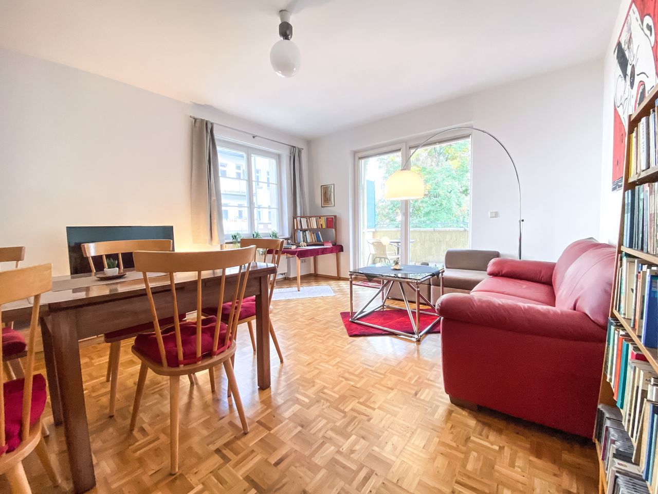 The apartment has a daylight bathroom with marble flooring, all other rooms with parquet flooring. Two sides of the bathroom walls are paneled door-height with marble slabs, with a tiled tub, double washbasin, wall lamps and ceiling downlights. The fitted kitchen meets modern standards and has an additional possibility of use with a breakfast corner. There is also extra access to the spacious balcony from the kitchen, which can also be accessed from the living room. The light-flooded living ro...
