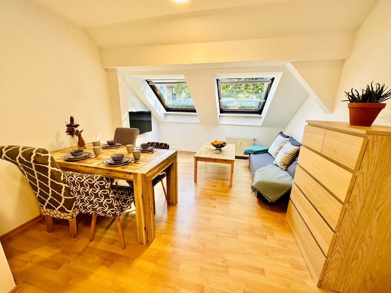 I rent a beautiful and fully furnished attic apartment (without elevator). Location: 3 minutes walk from Connewitzer Kreuz with connection to bus and tram. Rewe, bakery, bars and restaurants (Karl-Liebknecht-Str.) as well as forest and lakes in the immediate vicinity. It's all there, you just have to bring your own things. Everything you see in the photos is also there, unless something is not desired. We can talk about it individually. Bedroom: 180x200 cm bed, dimmable bedside lamps incl. c...
