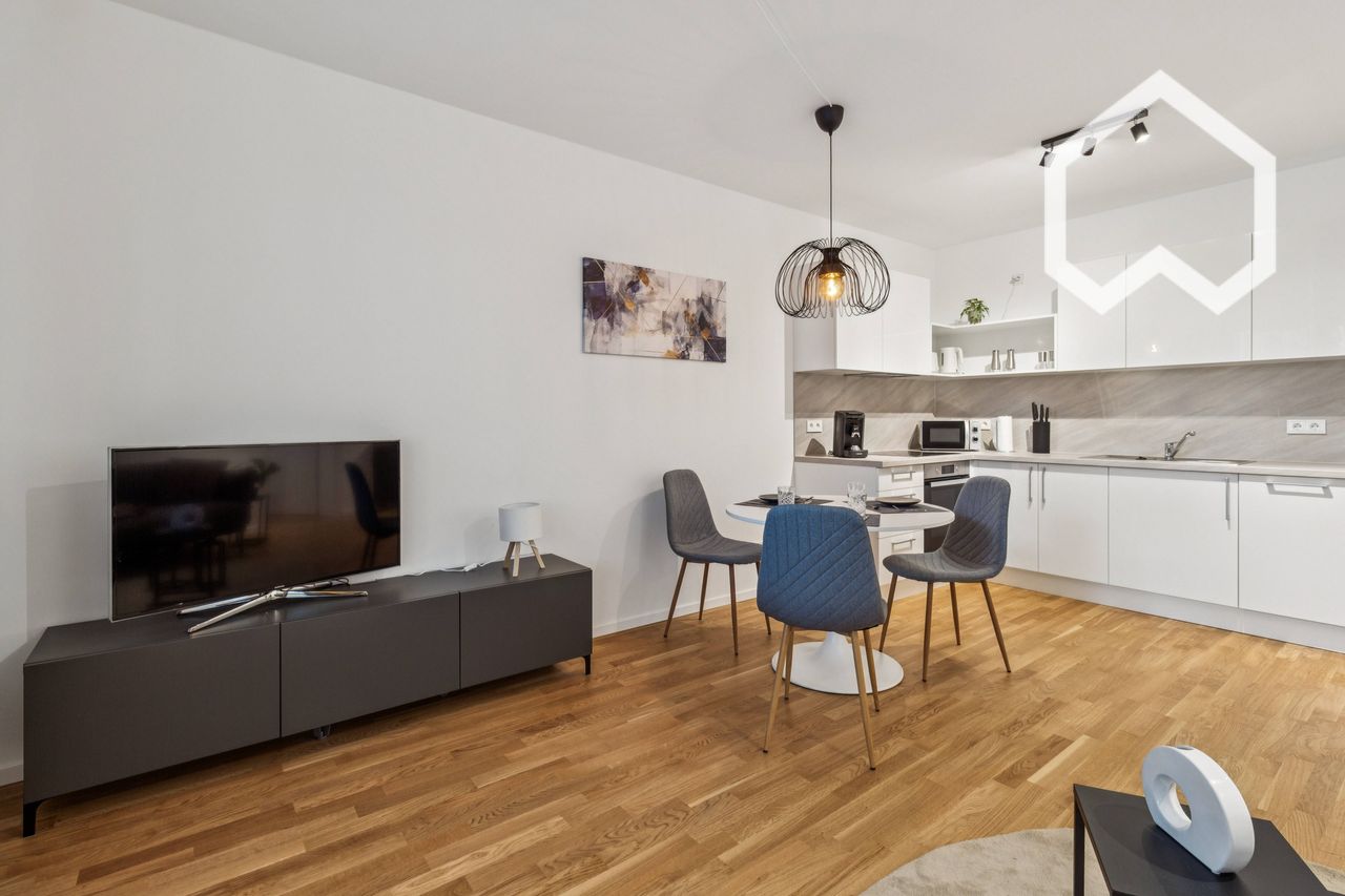 Welcome to Your New Home! This newly completed 52 m² two-room apartment impresses with its modern design, high-quality furnishings and a warm, comfortable atmosphere. Perfect for singles or couples who appreciate contemporary living. Located in a newly built residence, the apartment is fully furnished and equipped, with all utilities included - just move in and feel at home! The spacious living and dining area with an open kitchen offers plenty of natural light and a welcoming ambience. The be...