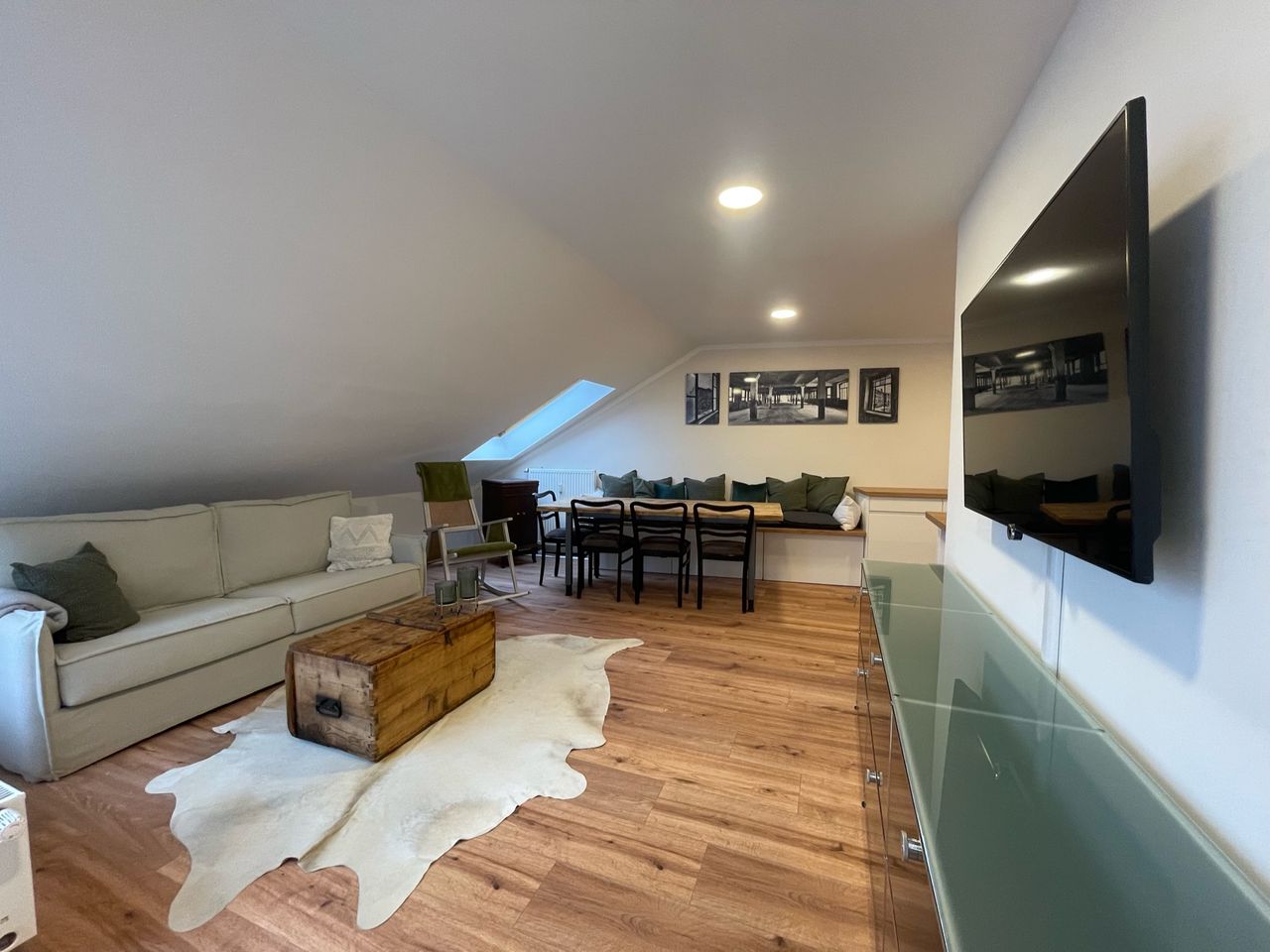 Above the roofs of the city you can enjoy your stay in our apartment in picturesque Gohlis. The perfect starting point to explore Leipzig like a local and work from your temporary home. In the immediate vicinity there are cafés, restaurants, beer gardens, the zoo and the riparian forest with cycle paths into the Leipzig Neuseenland. The apartment has been shining in new splendor since 2023. The apartment is located directly under the roof of an apartment building and you can easily reach it usi...
