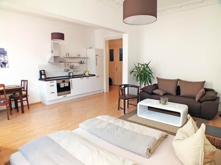 Welcome to the fully equipped, spacious flat near Leipzig's market square, right in the centre of Leipzig. The 54 m² apartment can accommodate up to 4 people, and there is also a sofa bed and an extra bed available. It is an ideal starting point for all visitors to the trade fair city.