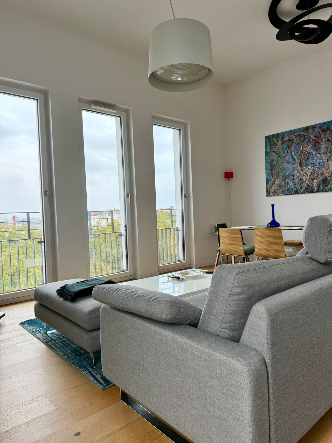 We are offering you our modernly furnished 1-bed-room flat. All shopping locations are nearby. The flat, with a total area of 75 m², is located on a quiet side street in the penthouse of a new building, which has been constructed in an energy-efficient manner. The flat has 2 terracies facing east and west. Our flat is equipped to a high standard and furnished in a contemporary design with no Swedish uniform chic. The well-thought-out room layout allows for optimal use of space, and the ceiling ...