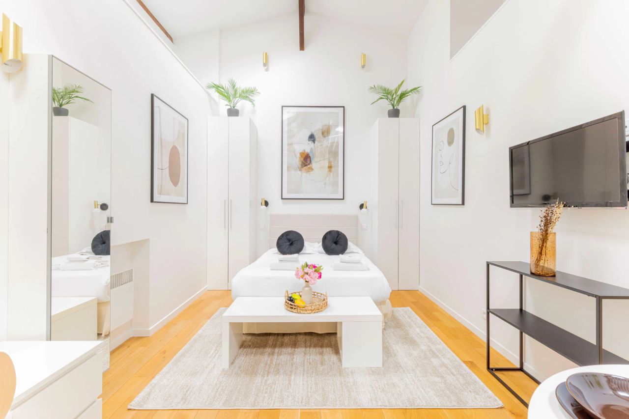 It is a large duplex of 20m2 refurbished in a beautiful building of Haussmanian type, on the 6th floor with elevator. It is composed of: - A living room with a double bed and a dining area - A mezzanine with a double bed - An open kitchen equipped with: refrigerator, microwave, induction cooker, kettle, coffee machine, toaster, washing machine...) - A shower room with WC - High speed internet (WiFi) and TV - Sheets and towels provided The neighborhood The neighborhood is very pleasant, lively an...