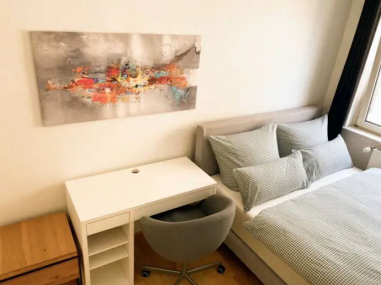 Please keep in mind that the 480€ cleaning fee + 480€ non-deposit fee have to be paid BEFORE moving in. This is an unlimited contract with 1 month notice. This is one of the 3 bedrooms in the apartment. The room is equipped with a box-spring bed with fine bedding, two bedside tables, a chest of drawers, a large closet, and a working desk with a corresponding working desk chair. In addition, there is a large elegant kitchen with all the necessary cooking equipment and utensils. The fridge of th...