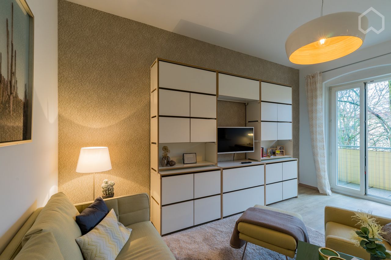 Object description Completely renovated 2 room old building apartment in a quiet residential area Prenzlauer Berg. Equipment Fitted kitchen with induction stove, separate oven, fridge-freezer, dishwasher and washing machine. Coffee machine, toaster and kettle as well as all other kitchen utensils and dishes are available. Living room with TV and fast internet connection, south-facing balcony with seating and view into the park-like garden. Sleeping area with double bed 160cm, large mirror and c...