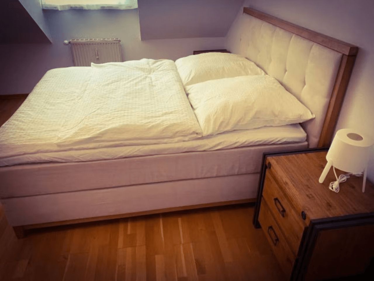 Please keep in mind that the 480€ cleaning fee + 480€ non-deposit fee have to be paid BEFORE moving in. This is an unlimited contract with 1 month notice. This is one of the 3 bedrooms in the apartment. YOUR ROOM: The room is equipped with a king-sized box-spring bed accompanied by fine bedding as well as two bedside tables, a chest of drawers, a working desk with a corresponding chair, and a large closet with a mirror. What really stands out is the private balcony, which offers a great view o...