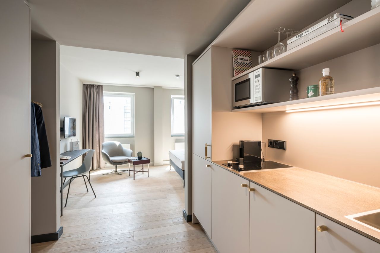 The Smart apartment combines an attractive size with all you could want from a longer- term, comfortable and independent stay – all without compromising on your need for space. This apartment is fully equipped and has a clever space division including a design kitchen, an eating area, a work and living area. At 1.4. or 1.6 meter wide, the bed is even comfortable enough for two. The comfortable armchair invites to relax, watch TV or listen to music.