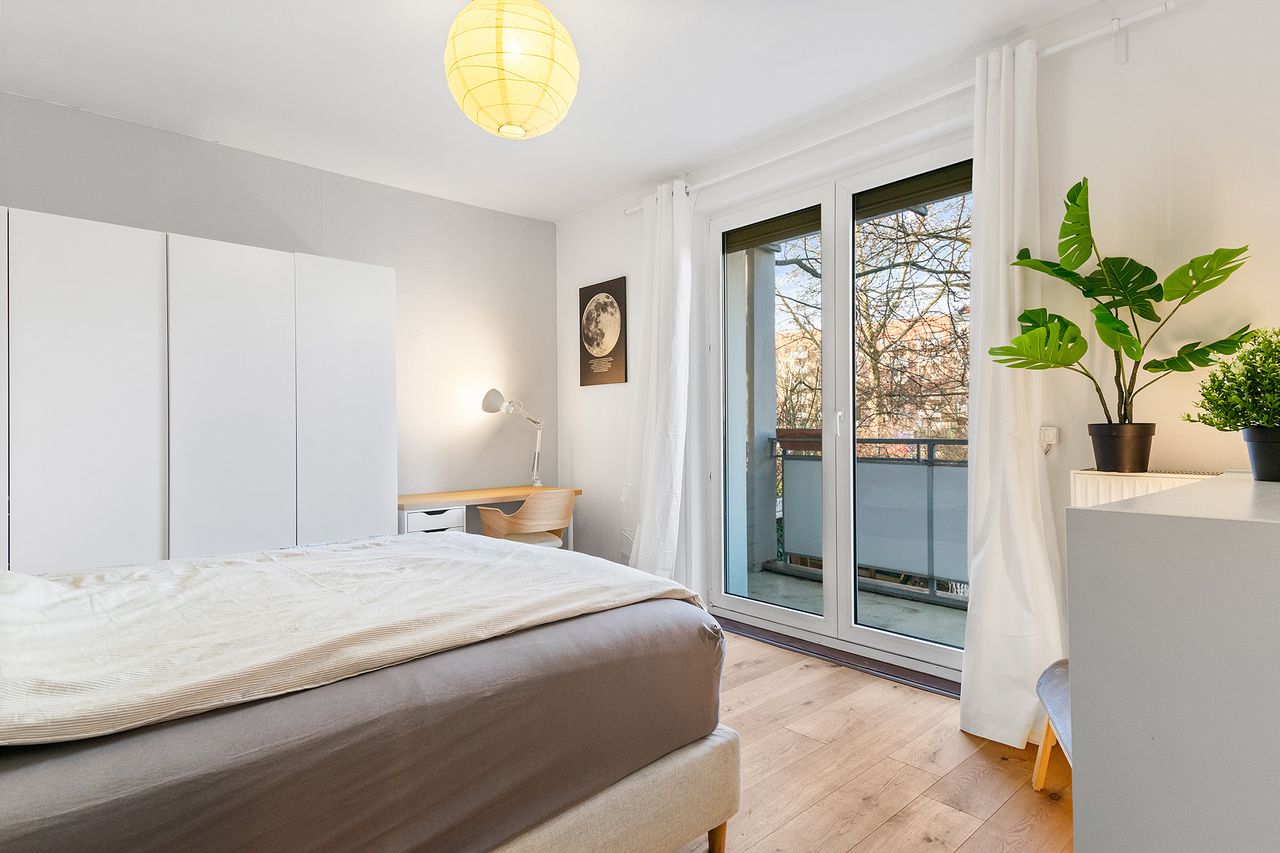 This beautifully renovated shared 2-room apartment in Friedrichshain’s Friedenstraße 47 offers a perfect balance of comfort and convenience. The 50 m² apartment includes two fully furnished bedrooms (16 m² with balcony, 14 m² without), a modern shared kitchen, and a bathroom with a bathtub and shower. It’s ideal for students, featuring high-quality furnishings such as boxspring beds, desks, and a fully equipped kitchen with a washing machine and refrigerator. Located on the Hochparterre, the apa...
