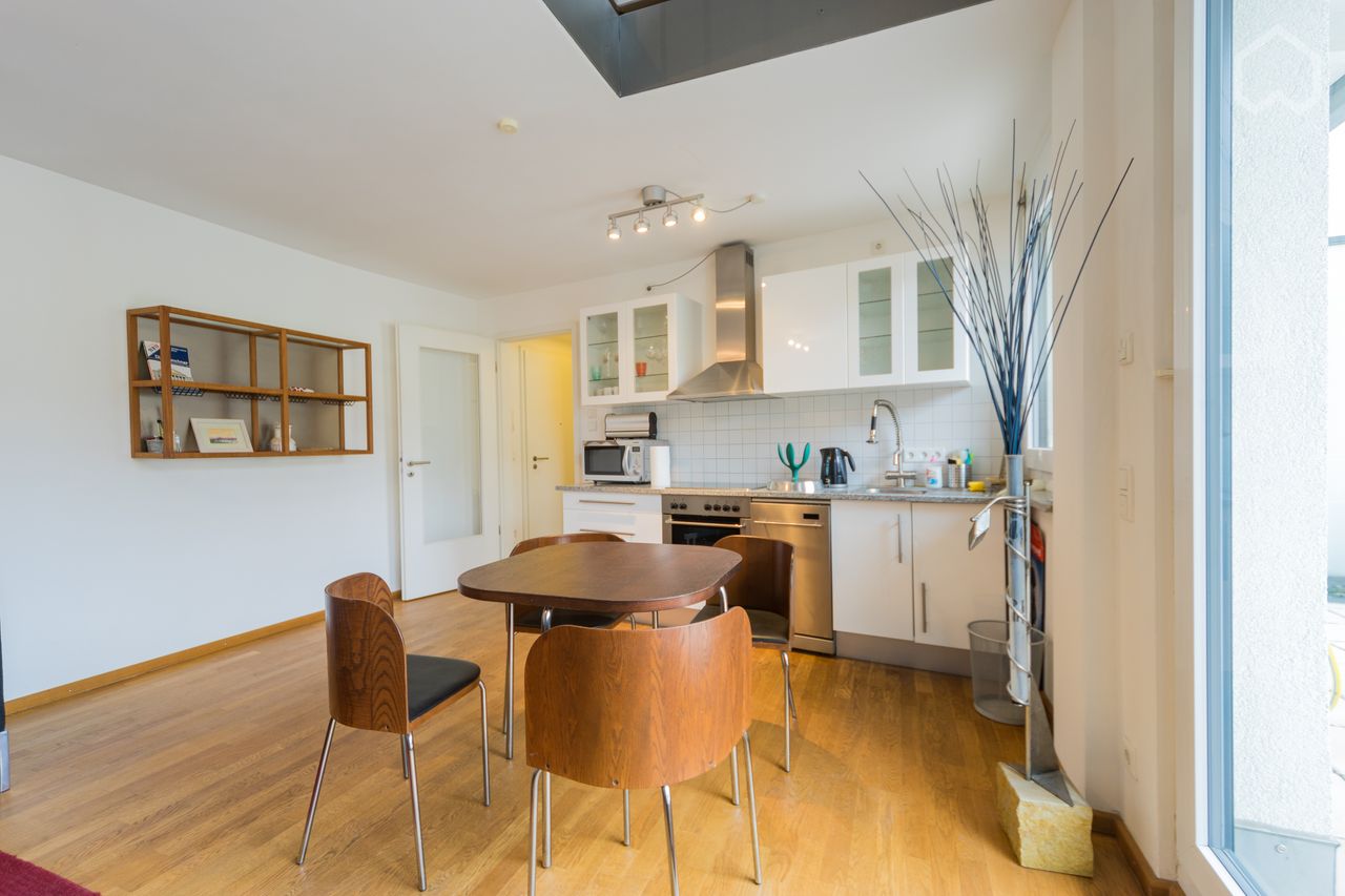 Bright and well located apartment with view over the roofs of Maxvorstadt. Large roof terrace. Living room with seating group and dining group. Bedroom with double bed. Bathroom with bathtub. Good open kitchen to the living area with crockery, dishwasher, extractor fan, fridge and microwave. Furnishing: functional modern style. Equipment: flat screen TV, internet, music system, cable TV, incl. bed linen and towels, ironing board, and vacuum cleaner. Location: central location in the area of the...