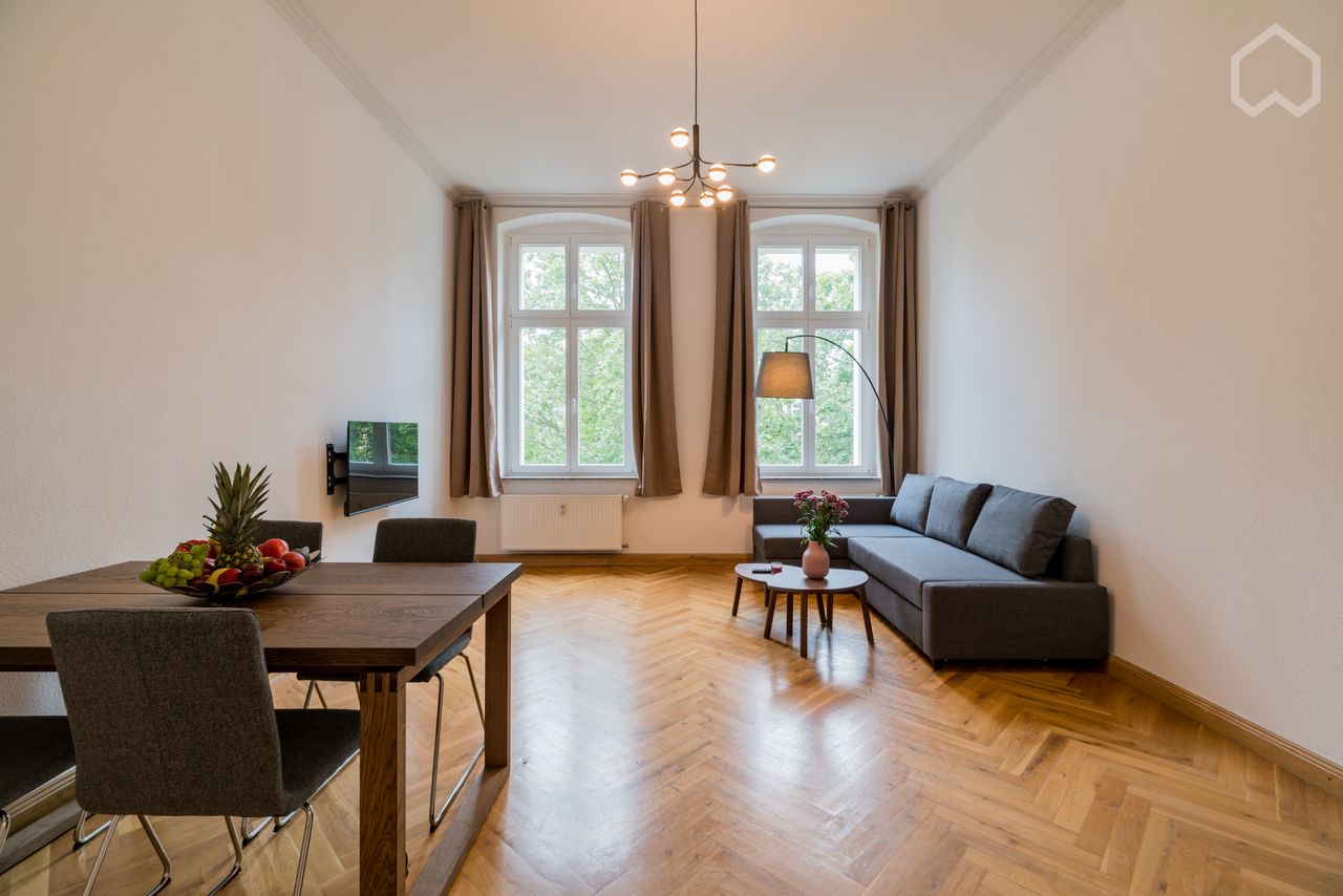 Beautiful very spacious and bright apartment fully furnished with modern furniture offers spacious living for two couples or a family. Located on the second floor it has 2 big bedrooms, living room, big kitchen/ dining room, storage room, spacious hallway and a nice sized bathroom with bathtub. The apartment is south facing and looks out onto a green boulevard. Located in charming Bergmannkiez district of Kreuzberg it offers all amenities on your door step - shops, restaurants, bars etc. The met...