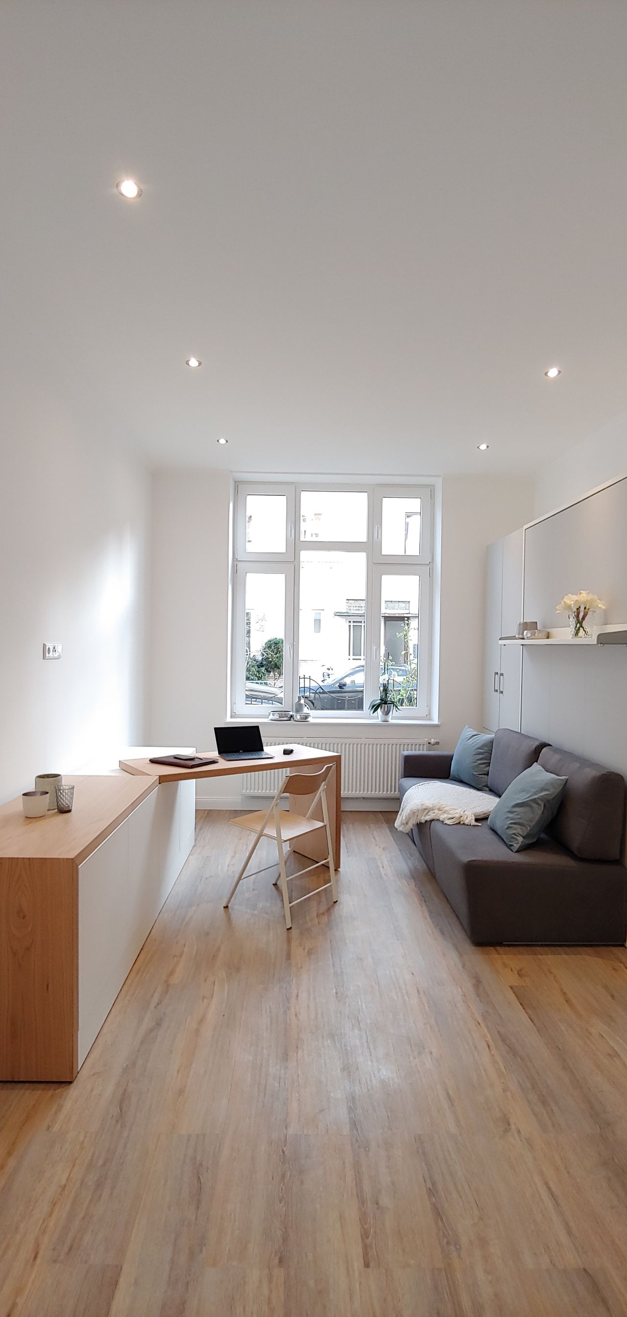 To offer is a completely newly renovated and exclusively furnished 1-room apartment. Equipment The apartment is equipped with exclusive and high-quality furniture such as bed/sofa, sideboard/desk/dining table (incl. 4 chairs), which can be converted as needed. Thus, no unnecessary living space is wasted and at the same time you do not have to sacrifice any comfort. The LED lighting system can be switched multiple times as well as, for a cozy mood, dim. The kitchen is equipped with dishwasher, w...