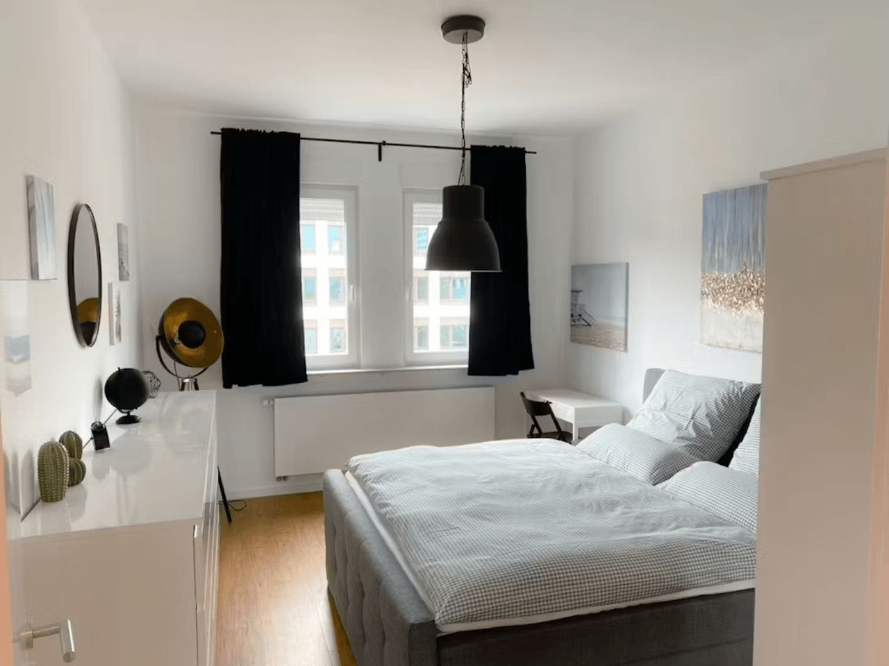 Please keep in mind that the 480€ cleaning fee + 480€ non-deposit fee have to be paid BEFORE moving in. This is an unlimited contract with 1 month notice. The apartment has 3 bedrooms. Each bedroom is equipped with electronic roller shutters, so a complete black-out of the room is possible. Each room offers a box-spring bed with fine bedding, two bedside tables, a floor lamp, a mirror, fine art, a big closet, a chest of drawers, a working desk, and a corresponding working desk chair. In additio...