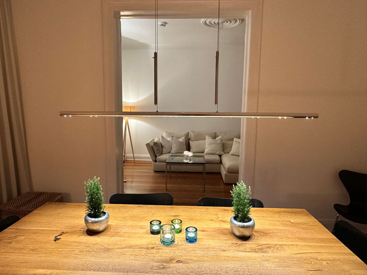 This stylishly furnished 65 sqm, 3-room apartment is located on the first floor of a quiet residential building and combines classic period charm with modern comfort. High ceilings (2.70 m), original stucco details, wooden floors, French doors and a historic Gründerzeit stove create a warm and elegant atmosphere. Two balconies facing east and west offer sunshine throughout the day. The apartment is fully equipped and thoughtfully furnished, featuring a cozy living room with sectional sofa and T...