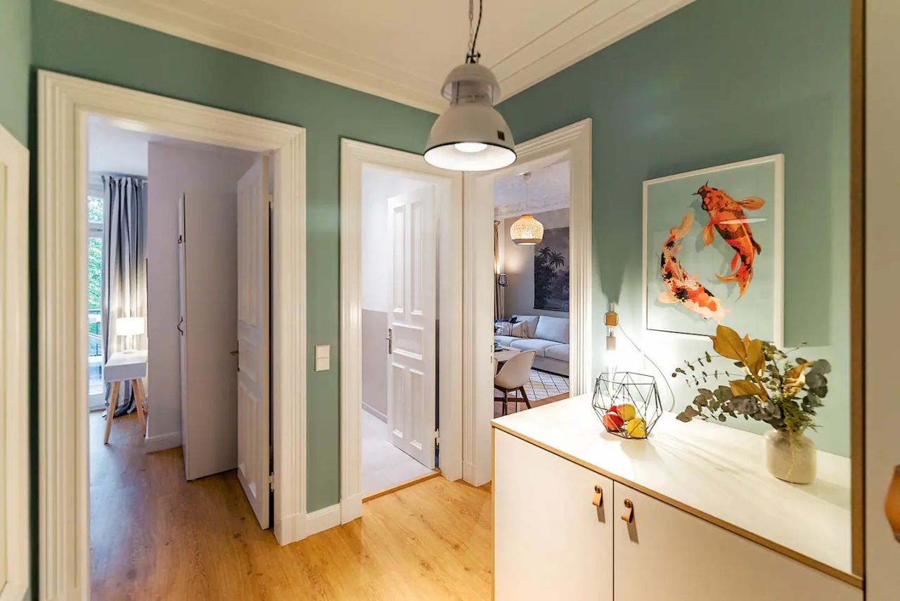 The bright apartment is located on the 1st floor of a newly renovated old villa in the charming and family-friendly district of Eimsbüttel. In the nearby surroundings are a variety of cafes, bakeries, restaurants, bars and boutiques. The Eimsbütteler Park directly behind the house also offers a wonderful recreational opportunity in the greenery with a view of the pond. For children, the large playground in the park offers plenty of variety.